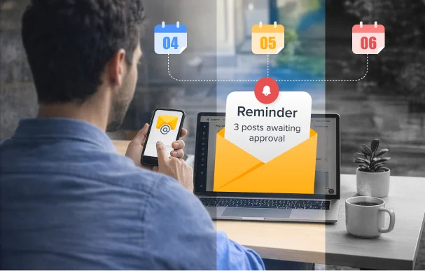 Automated email reminders keep pending approvals visible, helping clients and reviewers act in time so posts publish as planned.